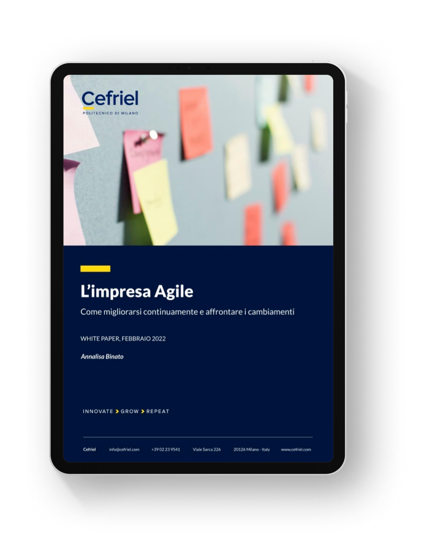 L’esperienza di Cefriel ha insegnato che, aldilà dei modelli disponibili, il percorso verso l’agilità è specifico per ogni azienda. Diventa quindi importante che nella definizione del percorso si consideri e si rispetti tutto questo: non ci si deve limitare a sostenere l’adozione di uno specifico modello per alcune dimensioni e attività dell’impresa, ma si deve partire dalla comprensione dell’azienda e dall’ascolto costante dei suoi bisogni, durante l’intero percorso costruito per creare un cambiamento culturale e operativo profondo e diffuso.